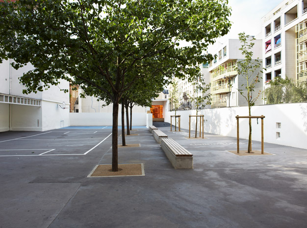 L'extension de la cour d'école sur une bande de trottoir disponible de la rue Léon, a permis de repenser totalement l'aménagement des lieux. La recréation est un moment important du temps scolaire, occasion d'apprentissages autour d'un espace collectif aménagé pour que chacun trouve sa place.