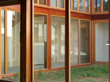 En mémoire à l'ancienne affectation, les façades du patio sont réalisées en bois en contraste avec l'ossature en acier de l'existant dont la présence dans le ciel du jardin prend une dimension énigmatique.